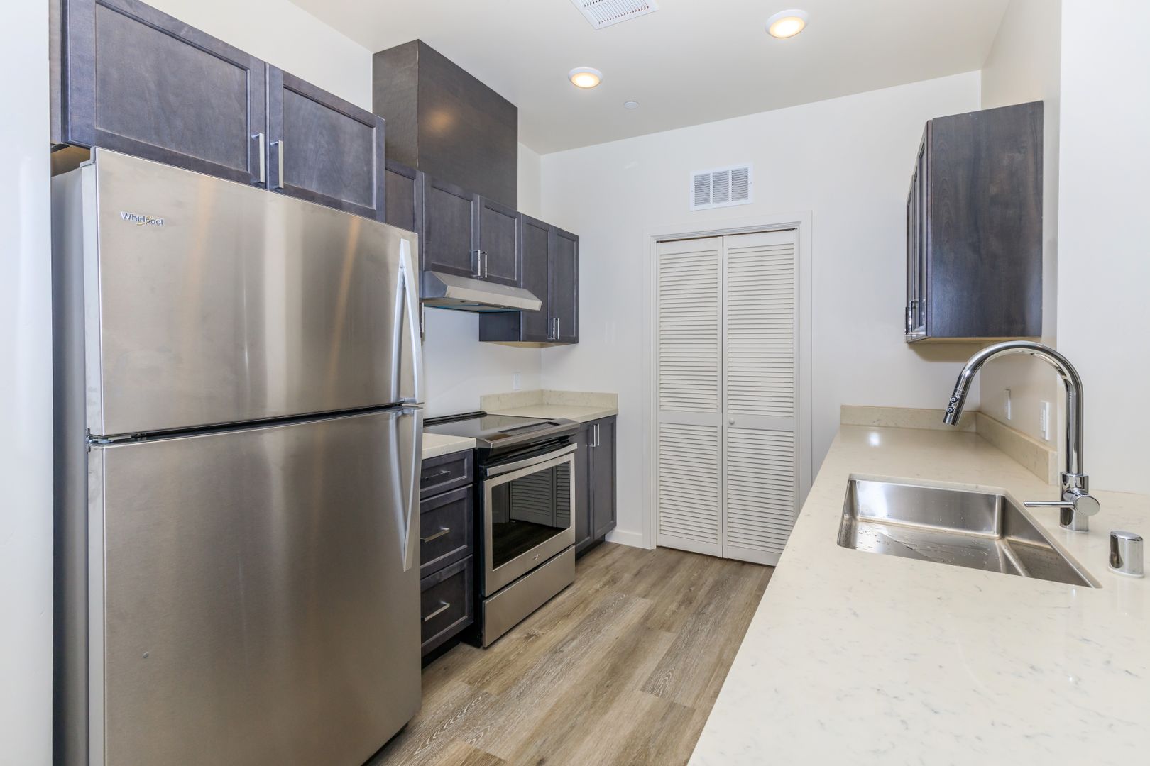 - Gourmet kitchen with Whirlpool stainless steel appliances, frameless maple wood cabinetry, large rectangular under-mount stainless steel sinks with high arching Pfister faucets, complete with quartz hard surface countertops.